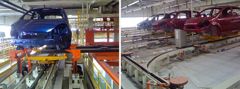 The system uses air and ground friction lines, mainly used for: P11/P12, B13 white body skeleton transport, referred to as transfer line, P11/P12/B13/H13/S22/A18 white body vehicle welding to painting The delivery and storage of the pieces, referred to as the storage line. The friction line can meet the simultaneous collinear production and transportation of the first six models.