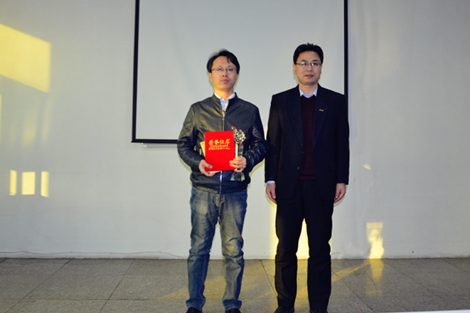 Picture 2 CEO Wang Yonghong awarded Guo Yinwen a "Innovation bedlamite" trophy, certificate and bonus