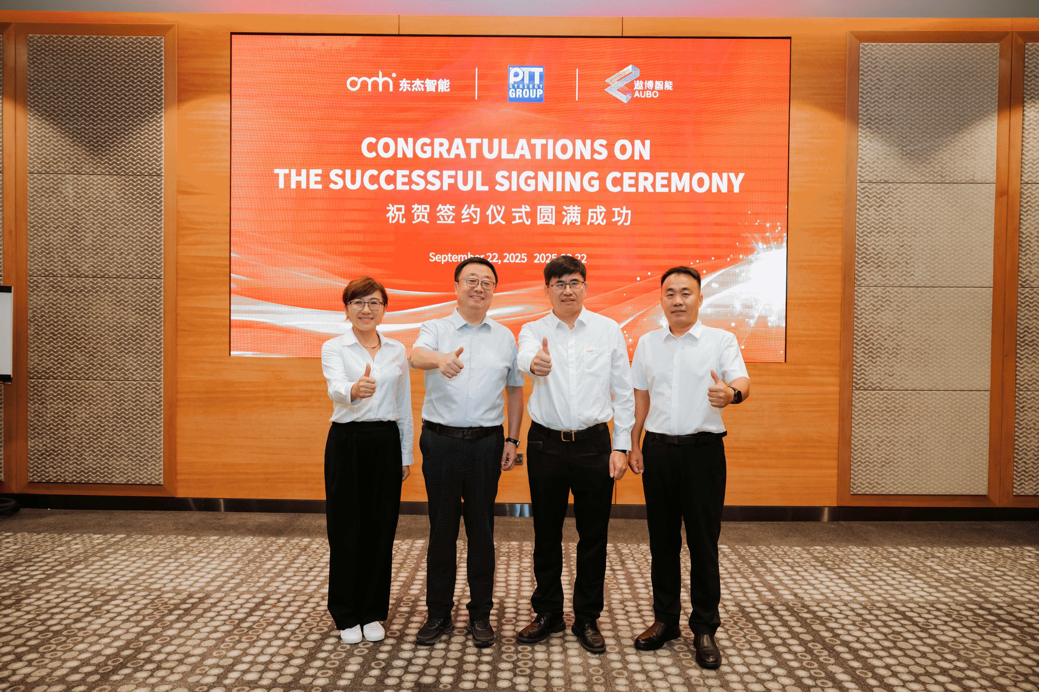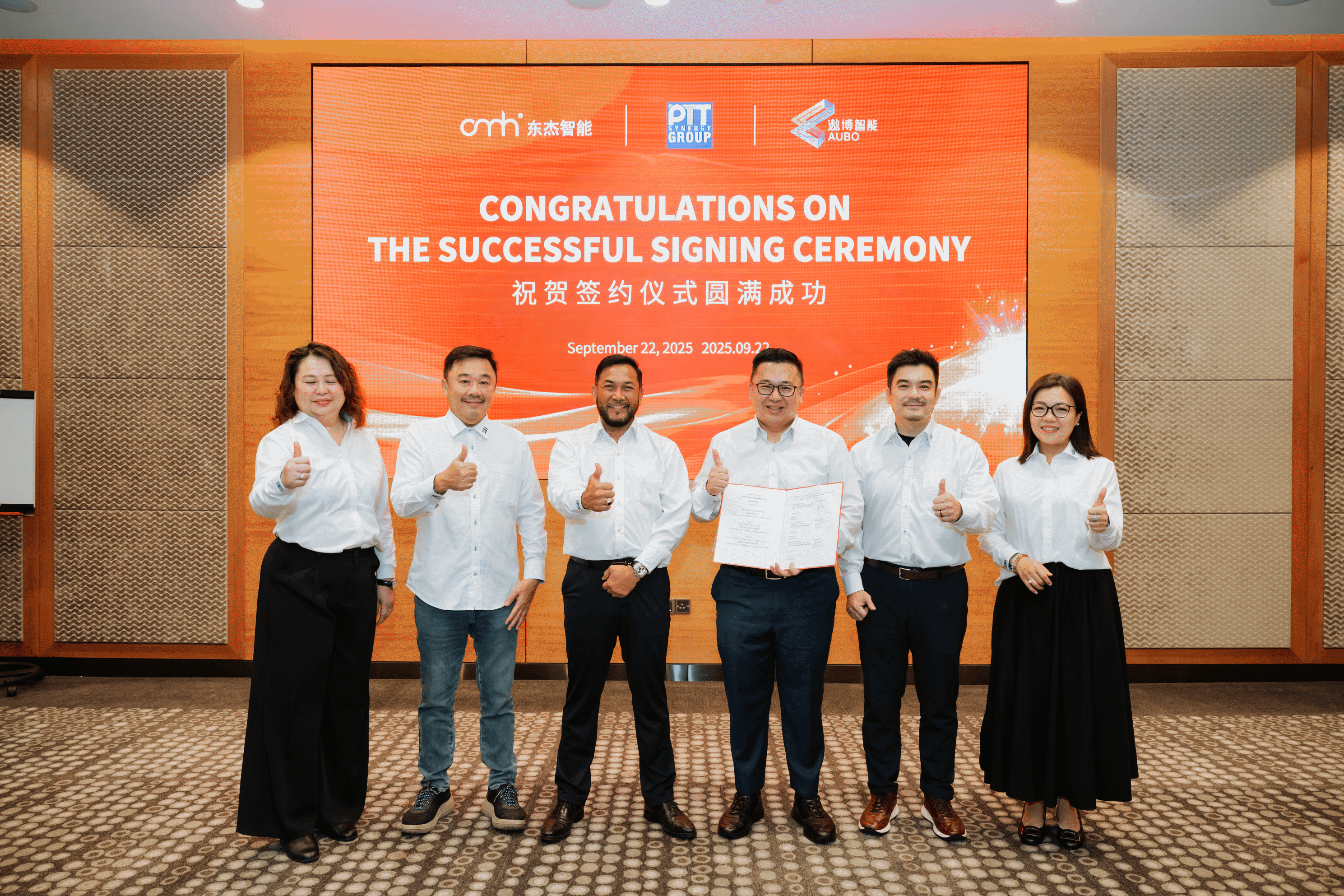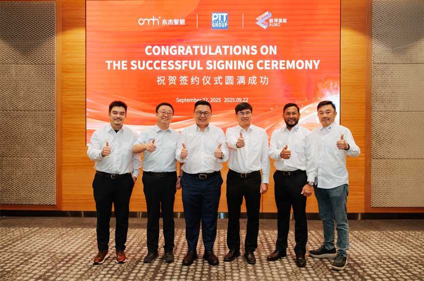 在各方見證下,東杰智能董事長韓永光、遨博智能董事長魏洪興與PTT集團(tuán)董事總經(jīng)理Teo Swee Phin共同簽署協(xié)議。